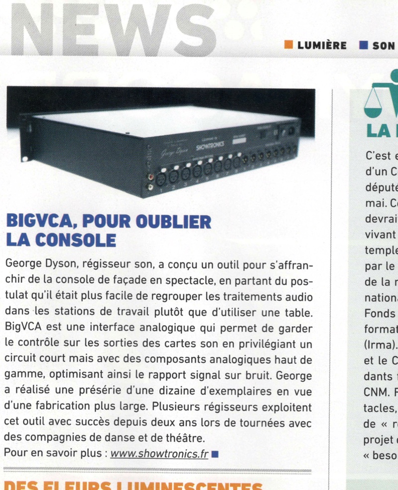 Sound engineer George Dyson has designed a device to bypass the mixing desk for live shows. George began by observing that a digital audio workstation should be able to process multiple audio signals better than a more complex setup with a mixer as the output device. BigVCA is an analog interface that enables sound engineers to control a sound card's audio outputs through minimalist high-end electronic circuitry while optimizing signal quality and SNR. For the moment, George has built 10 pre-production units, but plans to scale up production soon. A handful of sound engineers working on contemporary dance and theatre shows have reported favorably after using the box on tour for a couple of years.